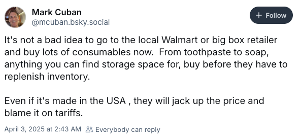 Mark Cuban Warns Of Price Hikes, Says ‘Buy Consumables Now,’ Before Retailers Blame Tariffs – Apple (NASDAQ:AAPL), Amazon.com (NASDAQ:AMZN) April 4, 2025 by Alex Freidmen … Read more